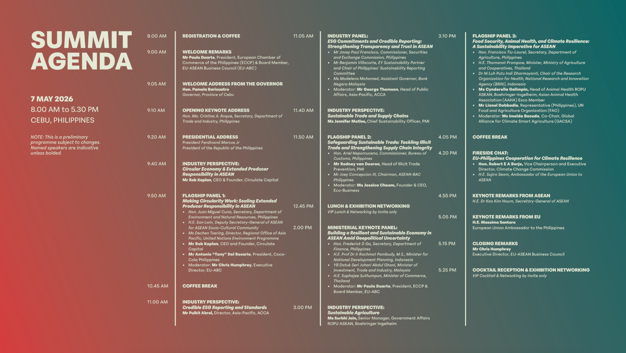 This event is jointly organised by the EU-ASEAN Business Council and the European Chamber of Commerce of the Philippines (ECCP) and endorsed by the Philippines' Department of Trade and Industry under the auspices of the Philippines' 2026 ASEAN Chairship. It is fully private sector-funded, supported by Boehringer Ingelheim, Coca-Cola ASEAN & South Pacific, PMI and ACCA Global.