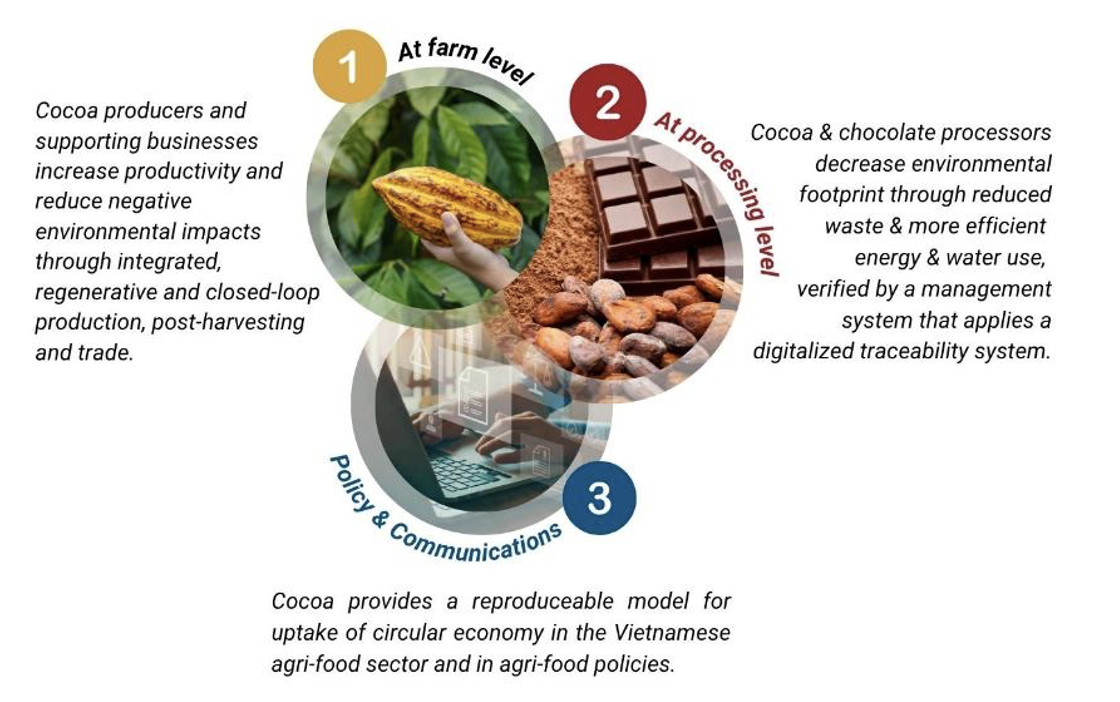 The "Circular Economy Cocoa: From Bean to Bar" project (2022–2026) was launched to address these systemic challenges. By targeting 3,500 cocoa farmers and 500 workers in related businesses, the project transforms the entire value chain. Cocoa was selected as the ideal pilot sector because its manageable size allows for a "proof of concept" that can be scaled across Vietnamese agriculture. To achieve this, the project focuses on three transformative pillars: